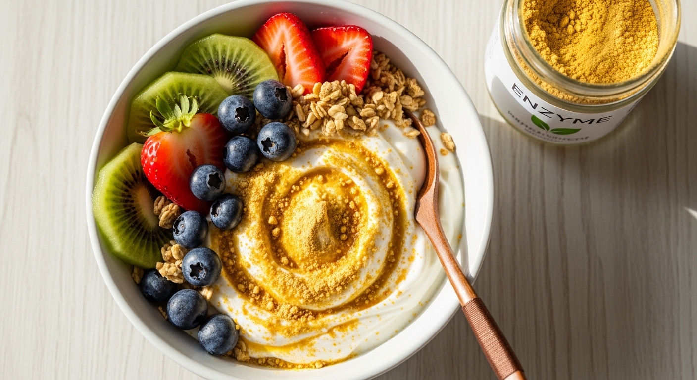매일 먹는 효소, 조금 더 맛있게 즐기고 싶다면 다양한 방법으로 활용해 보세요. 입안에 털어 넣고 미지근한 물과 함께 꿀꺽 삼키는 것이 가장 간편한 기본 섭취법이지만, 카뮤트효소 골드 제품들은 곡물 특유의 고소한 누룽지 맛이나 달콤한 인절미, 고구마 맛을 띠고 있어 음식에 곁들이기 아주 좋습니다. 바쁜 아침 식사 대용으로 그릭 요거트나 두유, 귀리 우유에 한 포를 섞어 든든하게 마시거나, 신선한 야채 샐러드 위에 드레싱과 함께 솔솔 뿌려 크런치한 식감을 더하는 토핑으로 활용해도 손색이 없습니다. 단, 효소는 열에 매우 취약한 특성을 가지고 있으므로 뜨거운 물에 타서 마시거나 펄펄 끓는 찌개 등의 음식에 섞는 것은 효소의 활성도를 떨어뜨릴 수 있으니 반드시 찬물이나 미지근한 온도로 즐겨주세요.